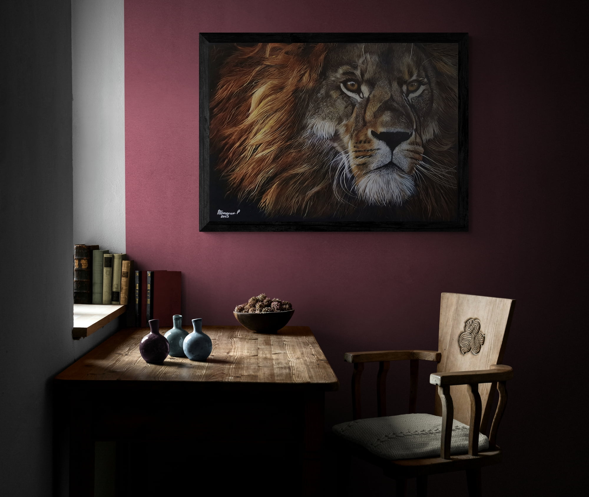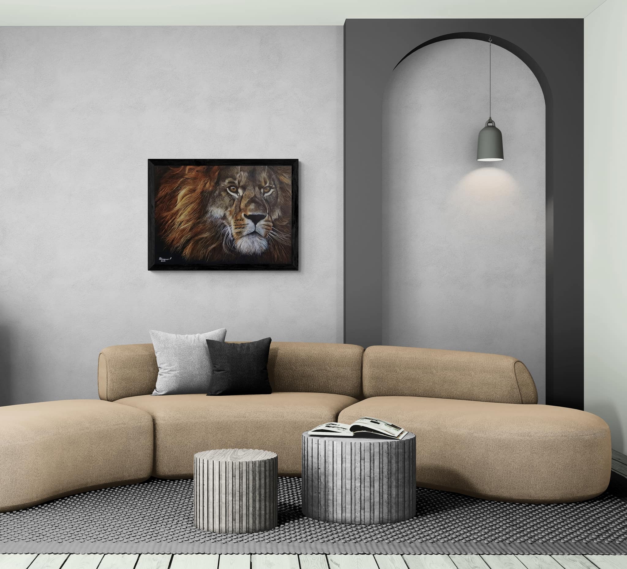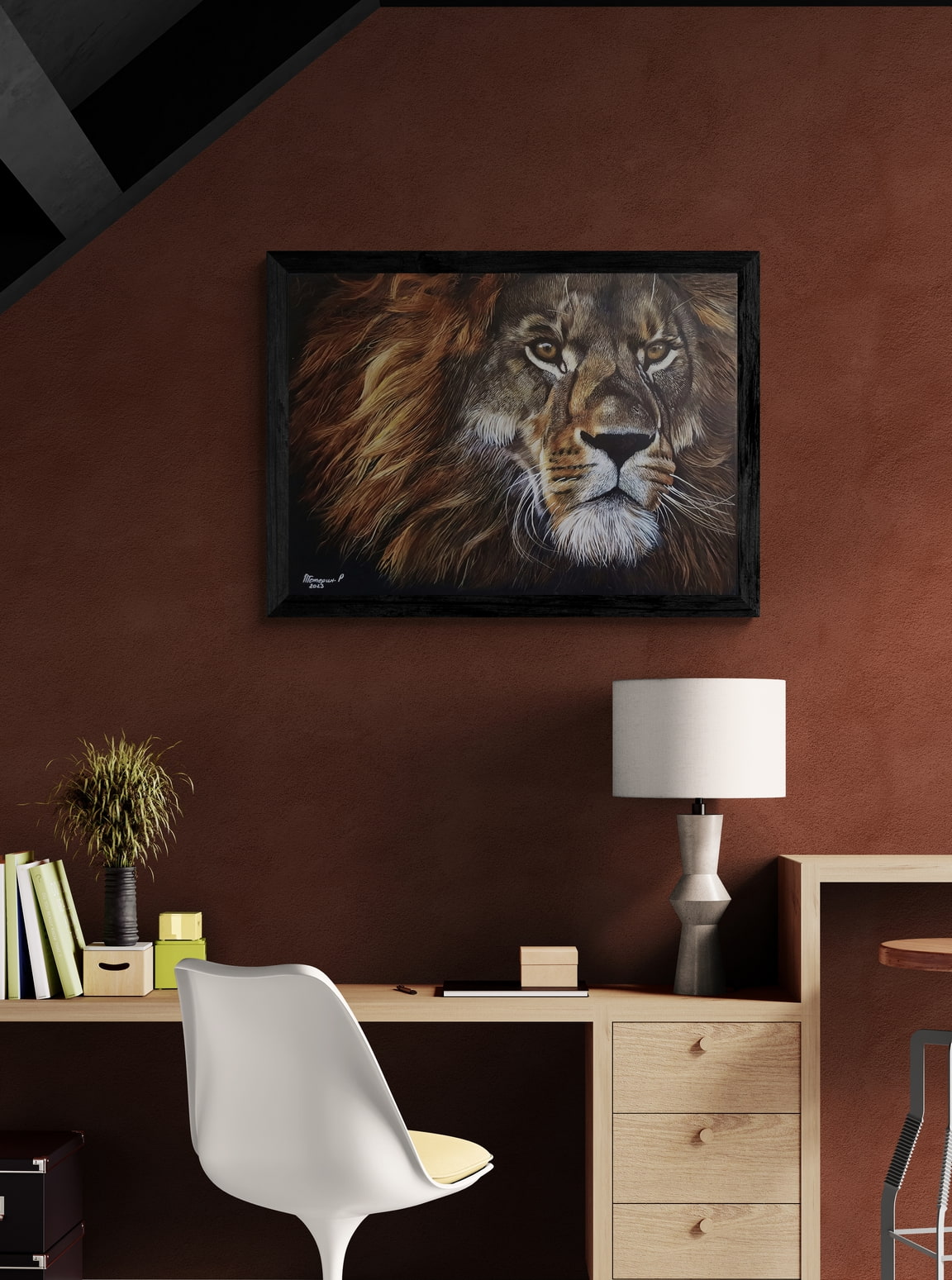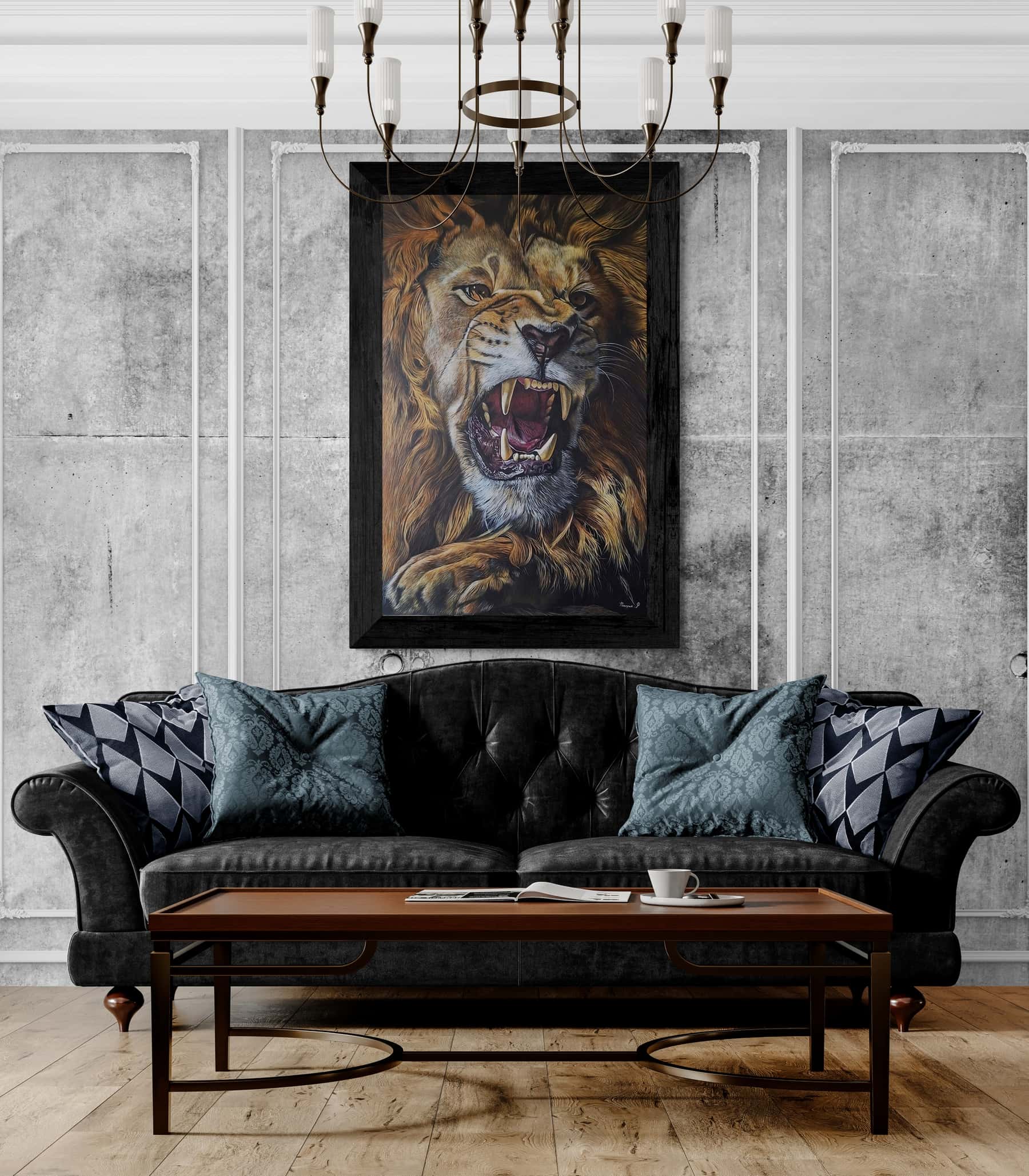 Dans cette œuvre, le lion devient plus qu’un animal : il est la personnification du courage, du leadership et de la dignité. Sa présence rayonne dans l’espace, transformant l’atmosphère de la pièce en un lieu empreint de caractère et de calme puissance.