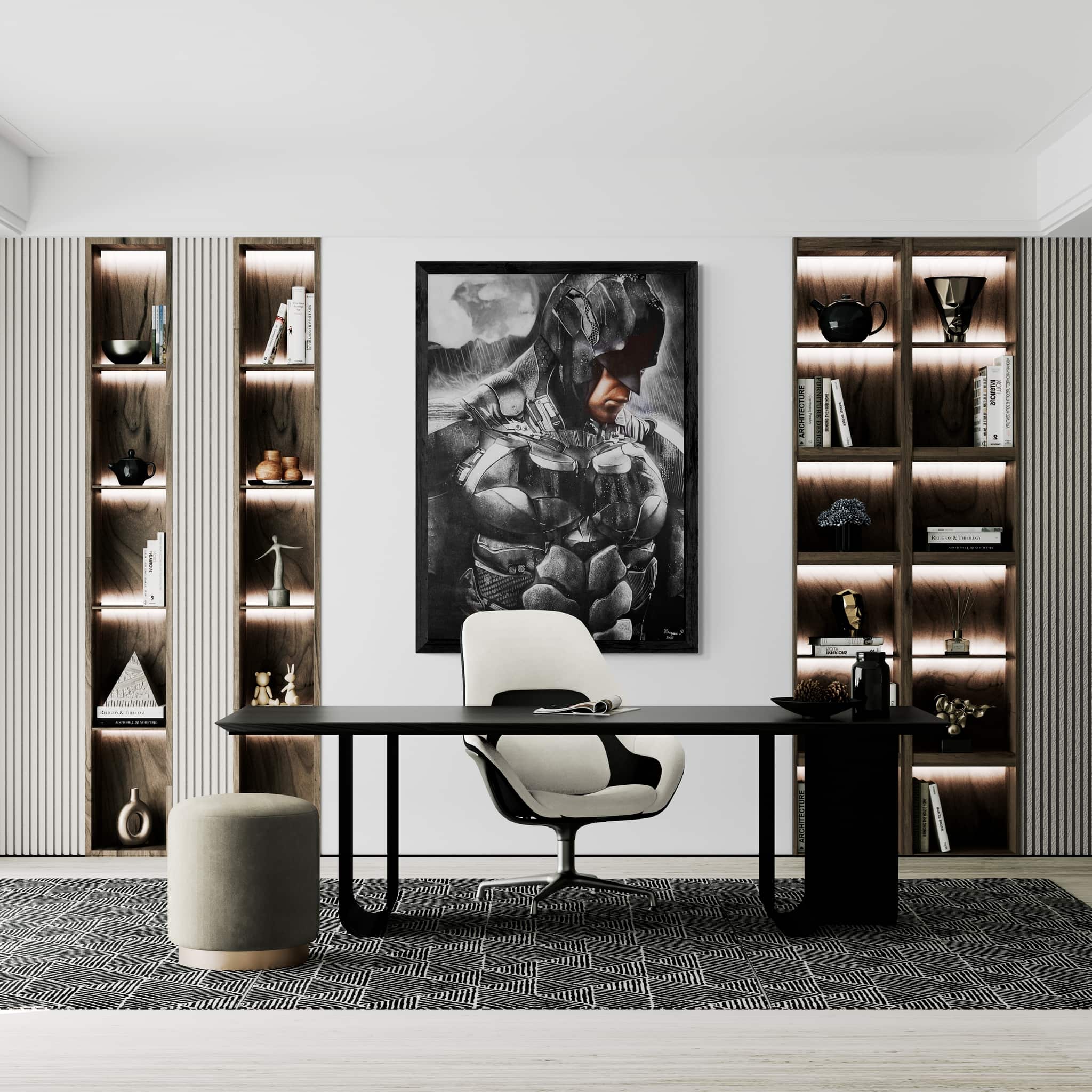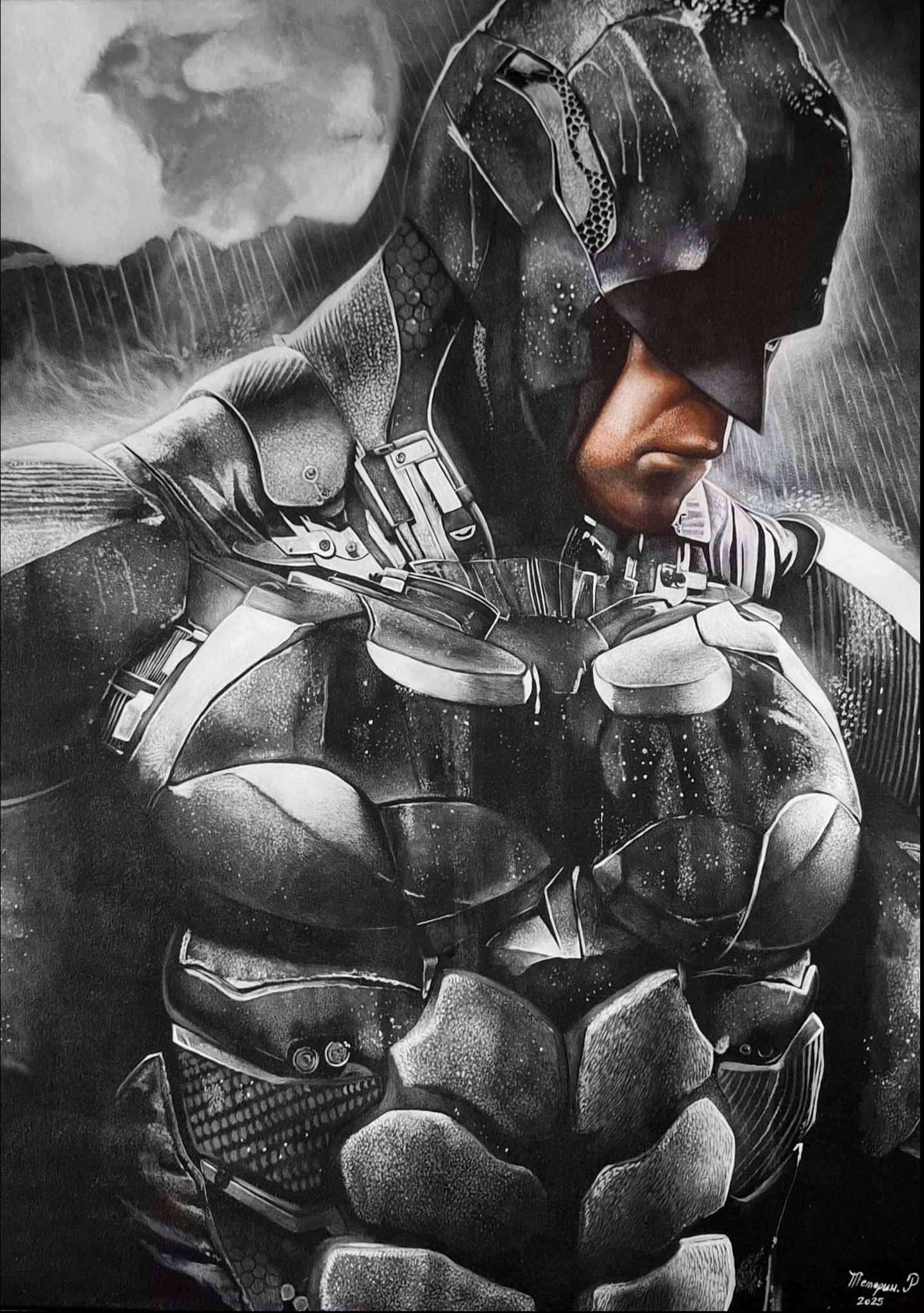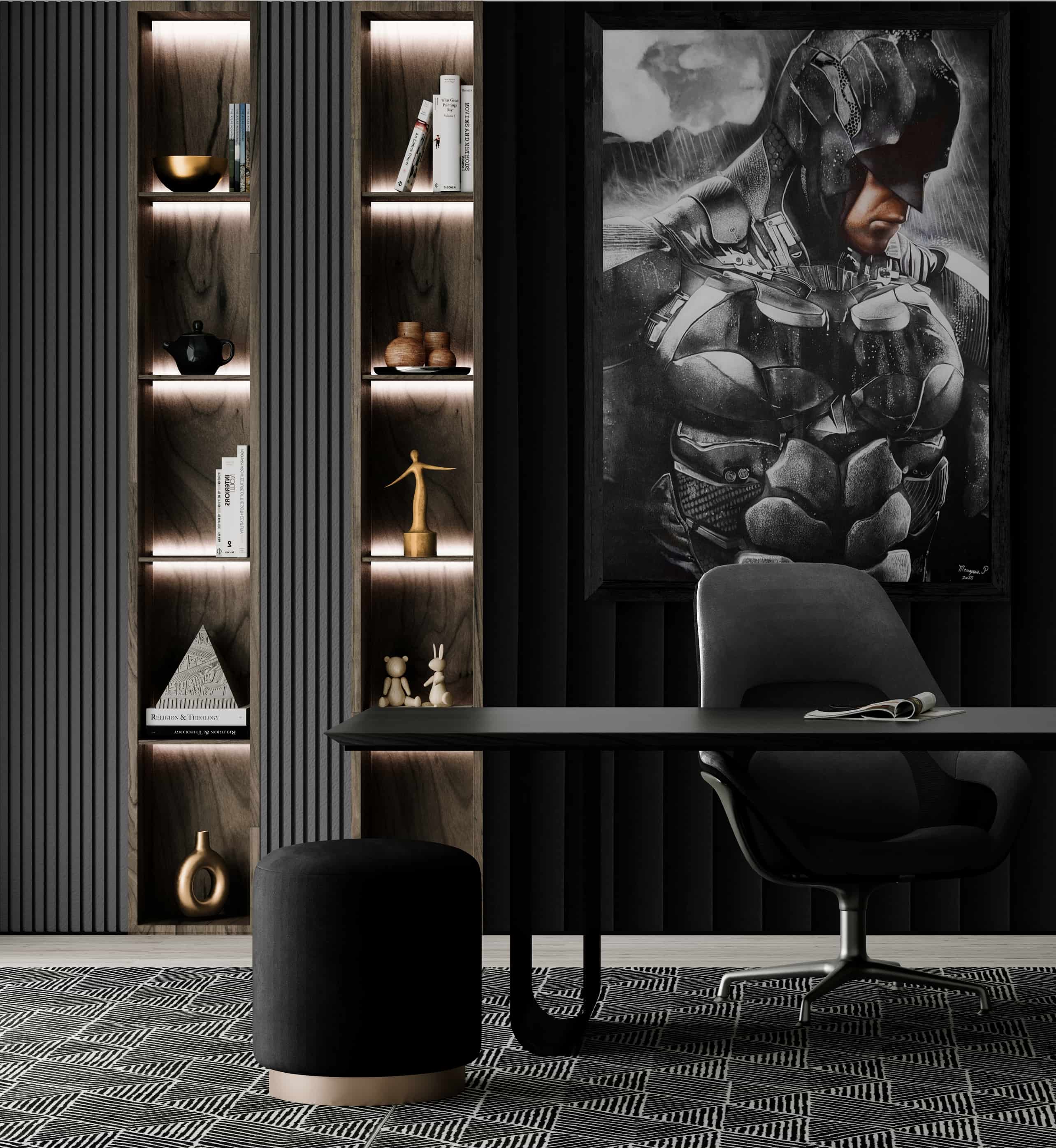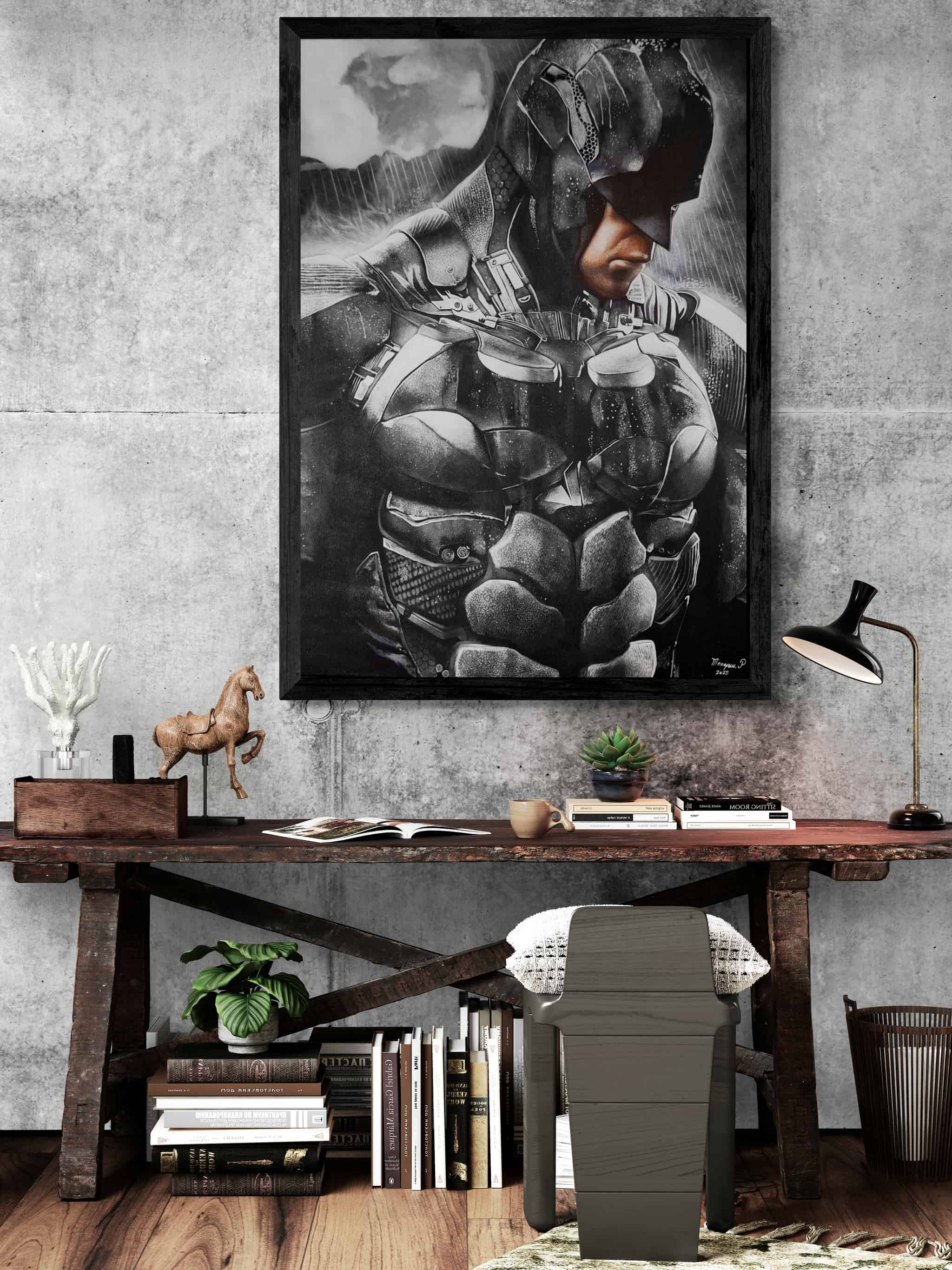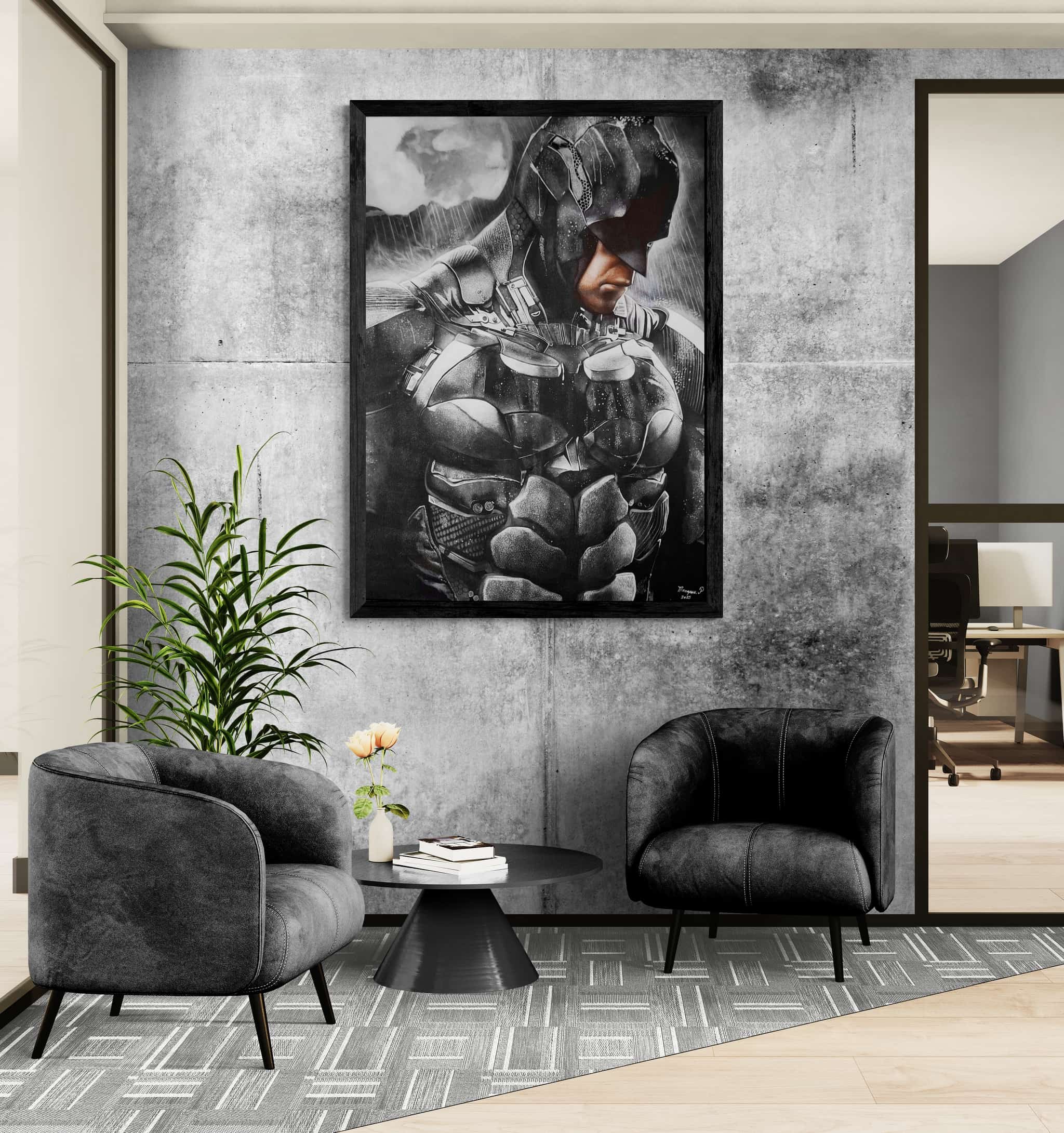 Cette œuvre capte l’essence du héros solitaire, une figure sculptée dans l’acier et l’ombre. Chaque détail du costume, chaque jeu de lumière et de texture révèle une présence à la fois humaine et mythique. Le regard baissé exprime la détermination silencieuse d’un protecteur, prêt à porter seul le poids du monde.