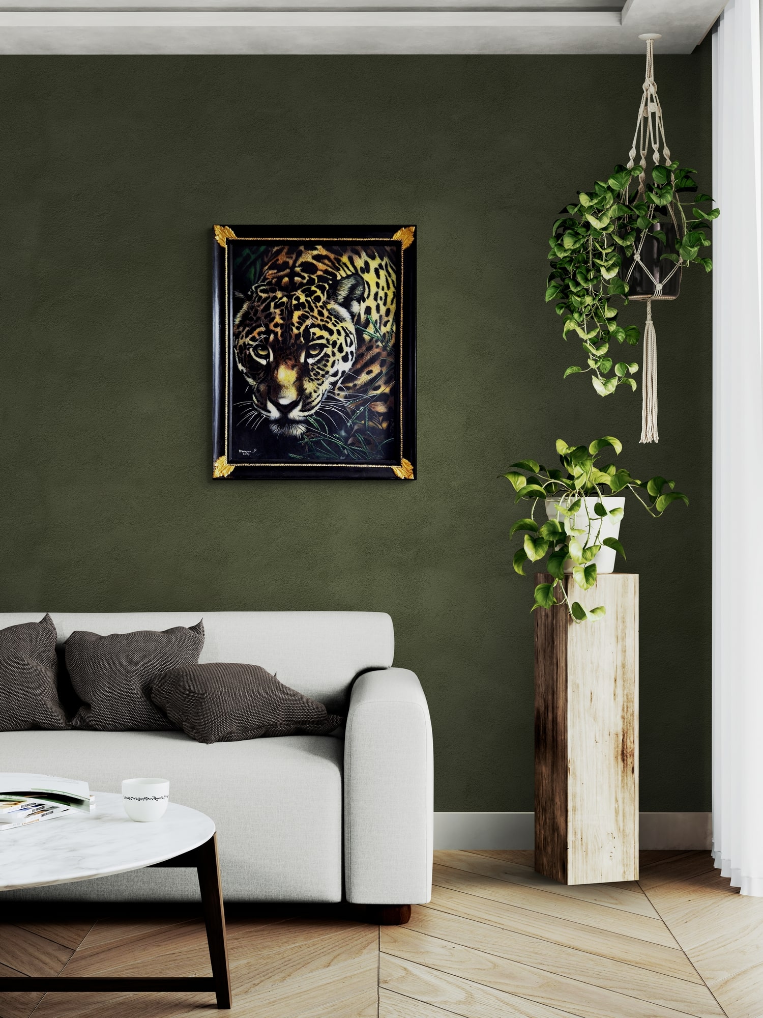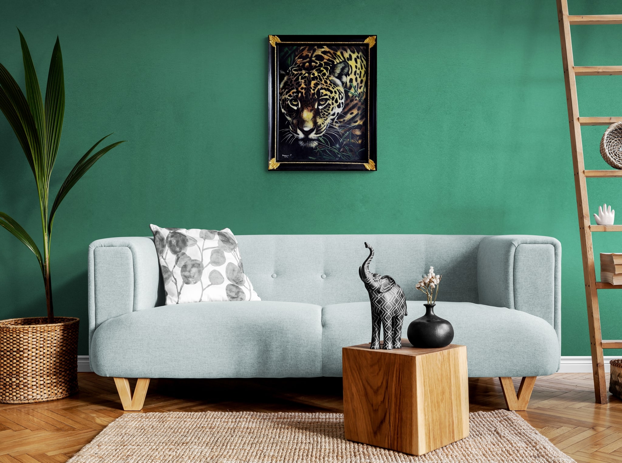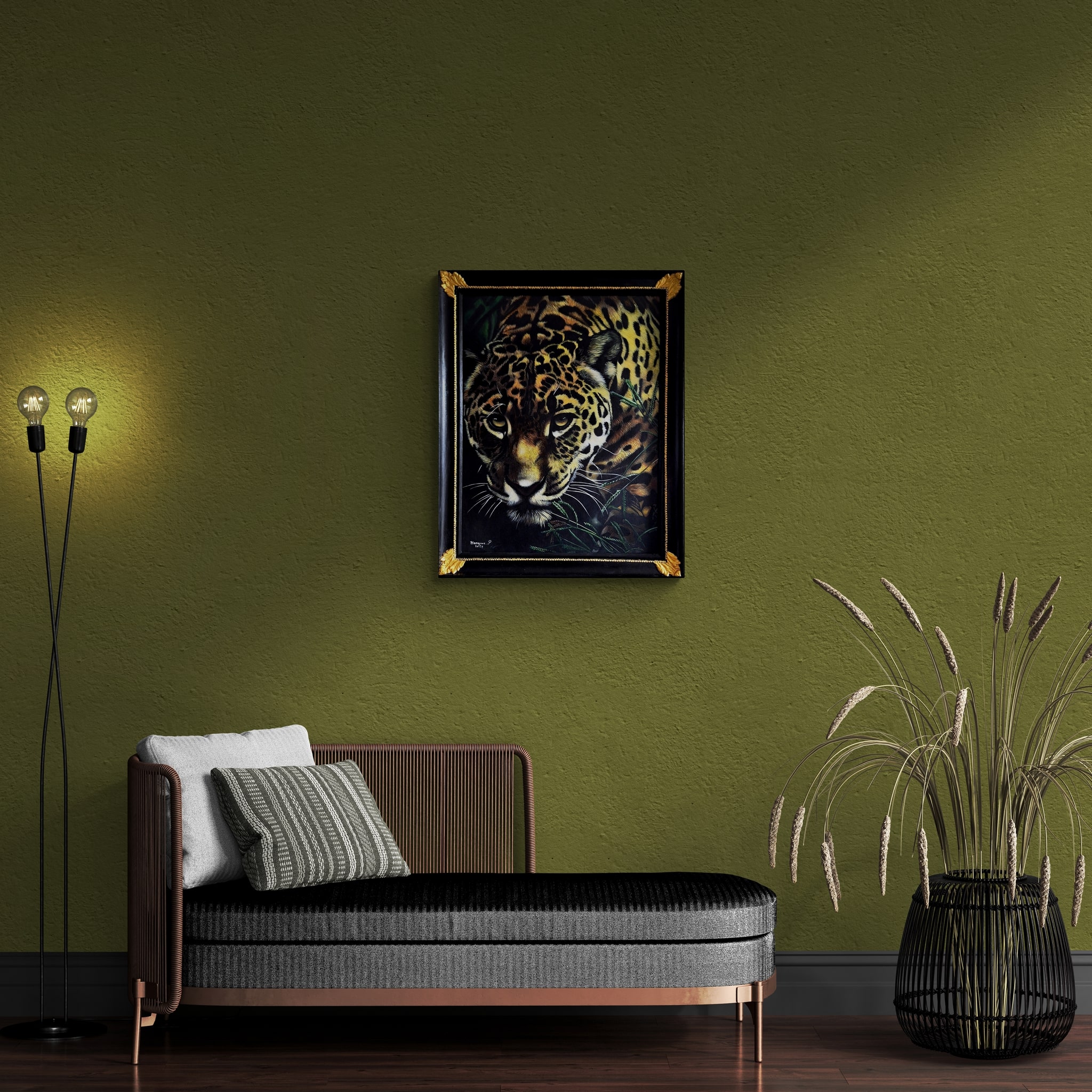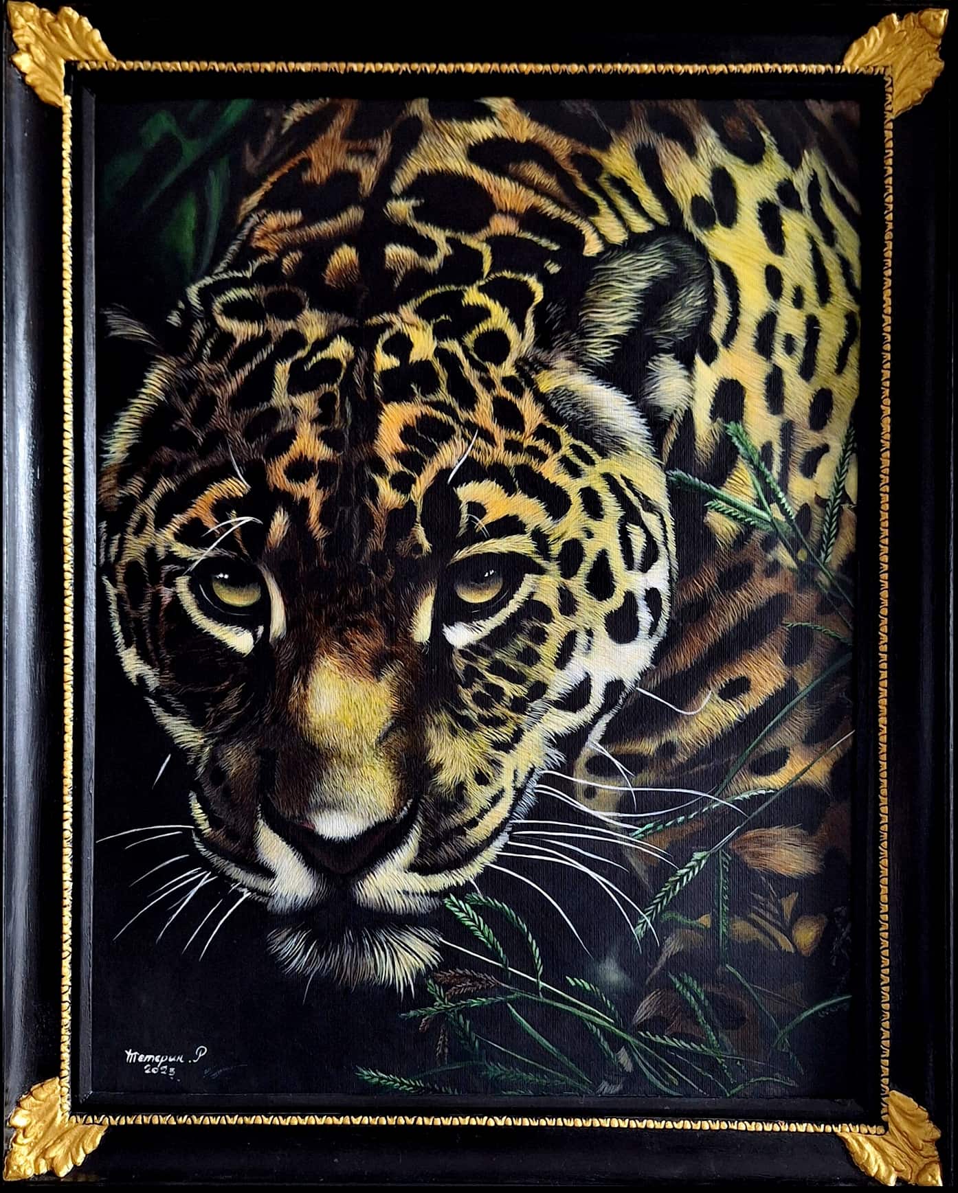 Dans ce tableau, le jaguar est saisi à l’instant décisif de la chasse : muscles tendus, regard implacable, démarche mesurée avec une précision absolue. La fourrure, peinte poil par poil, crée une illusion presque tactile — comme si l’on pouvait en sentir la texture sous la main. Le jeu d’ombre et de lumière accentue la tension : le prédateur semble suspendu entre invisibilité et révélation, prêt à bondir.