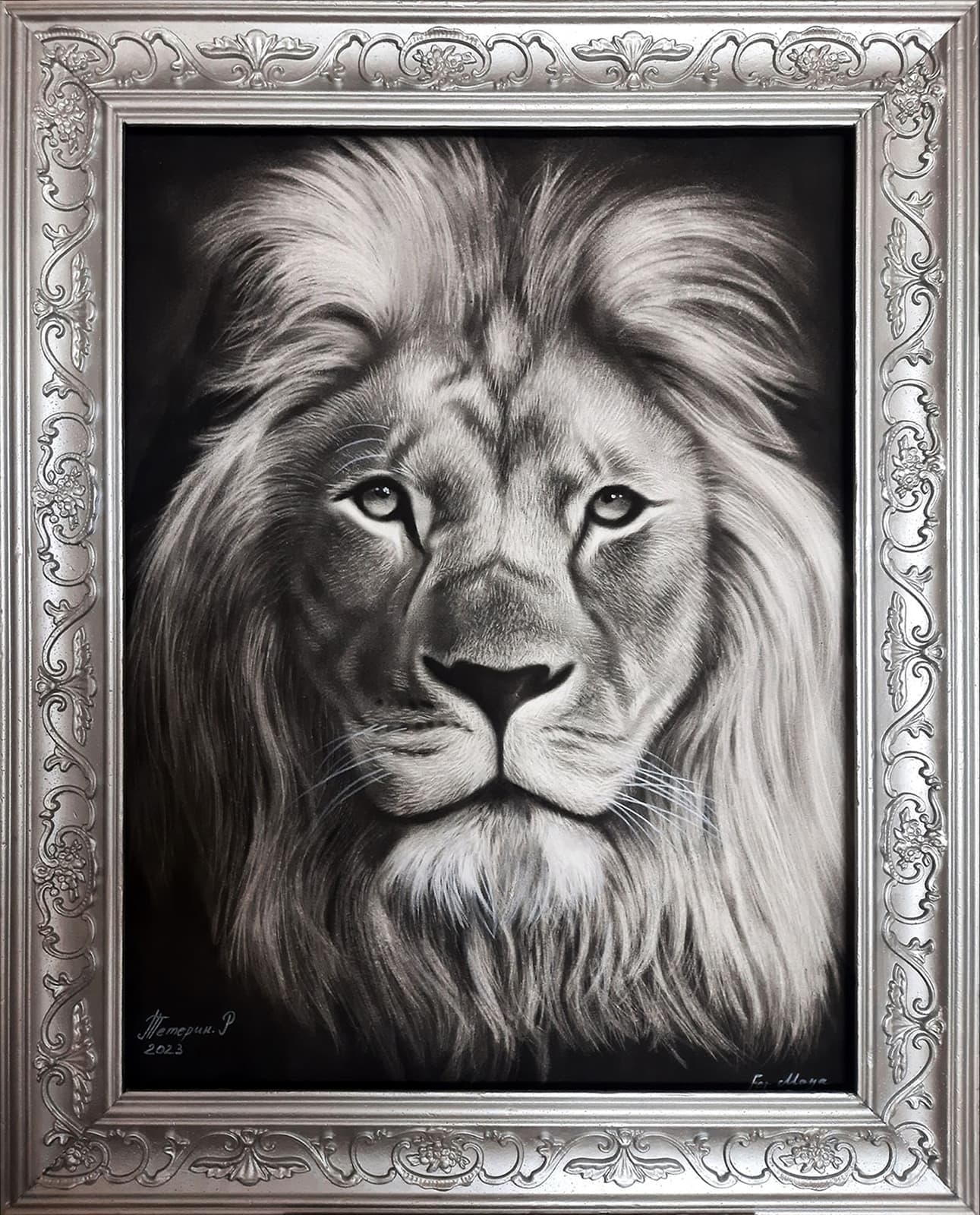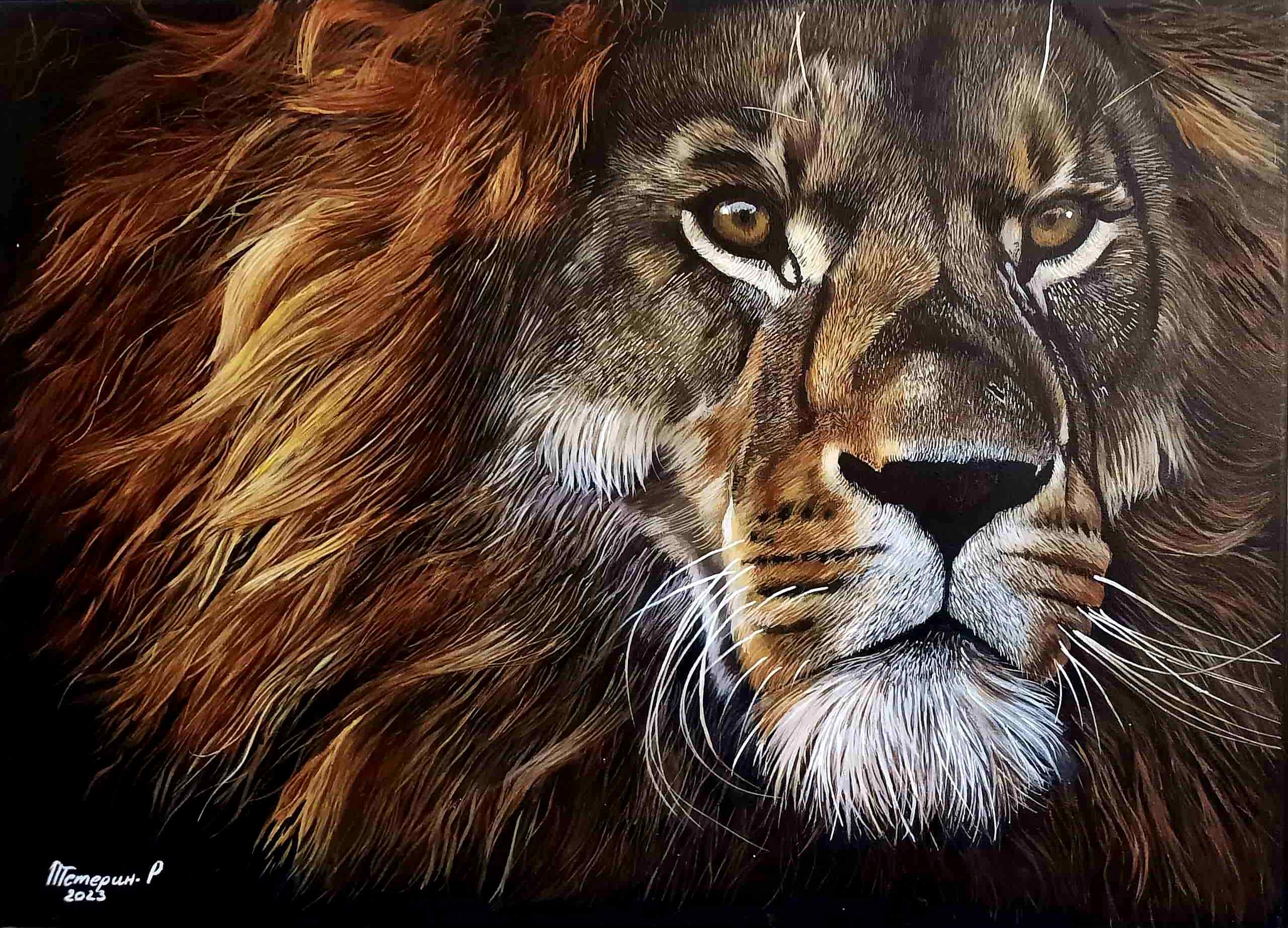 Ce lion, représenté au moment précis de son rugissement, incarne la puissance à l’état brut. Son expression est un mélange de rage, de protection et de souveraineté. La crinière, peinte avec une précision extrême, transmet le mouvement, la chaleur et la grandeur de l’animal.