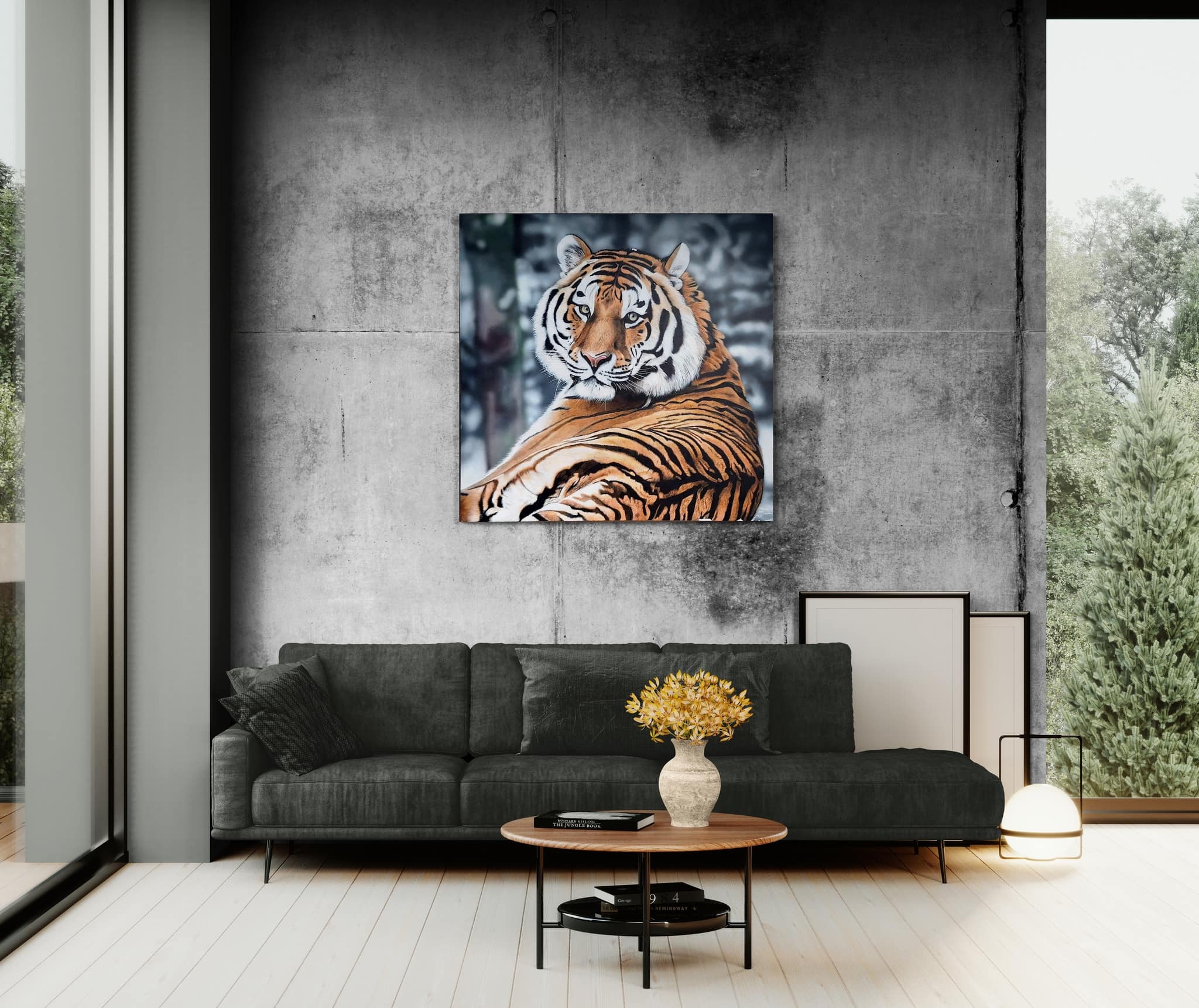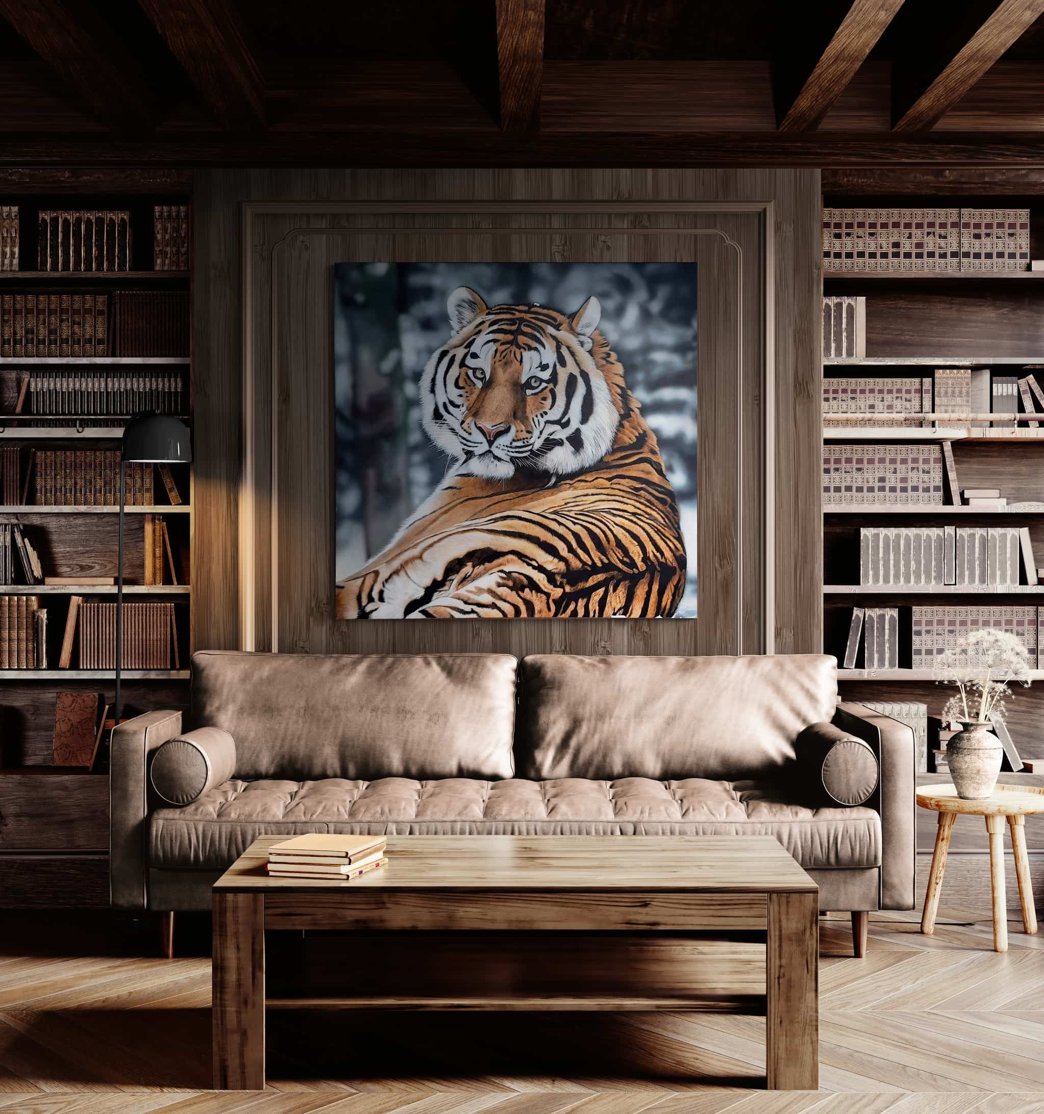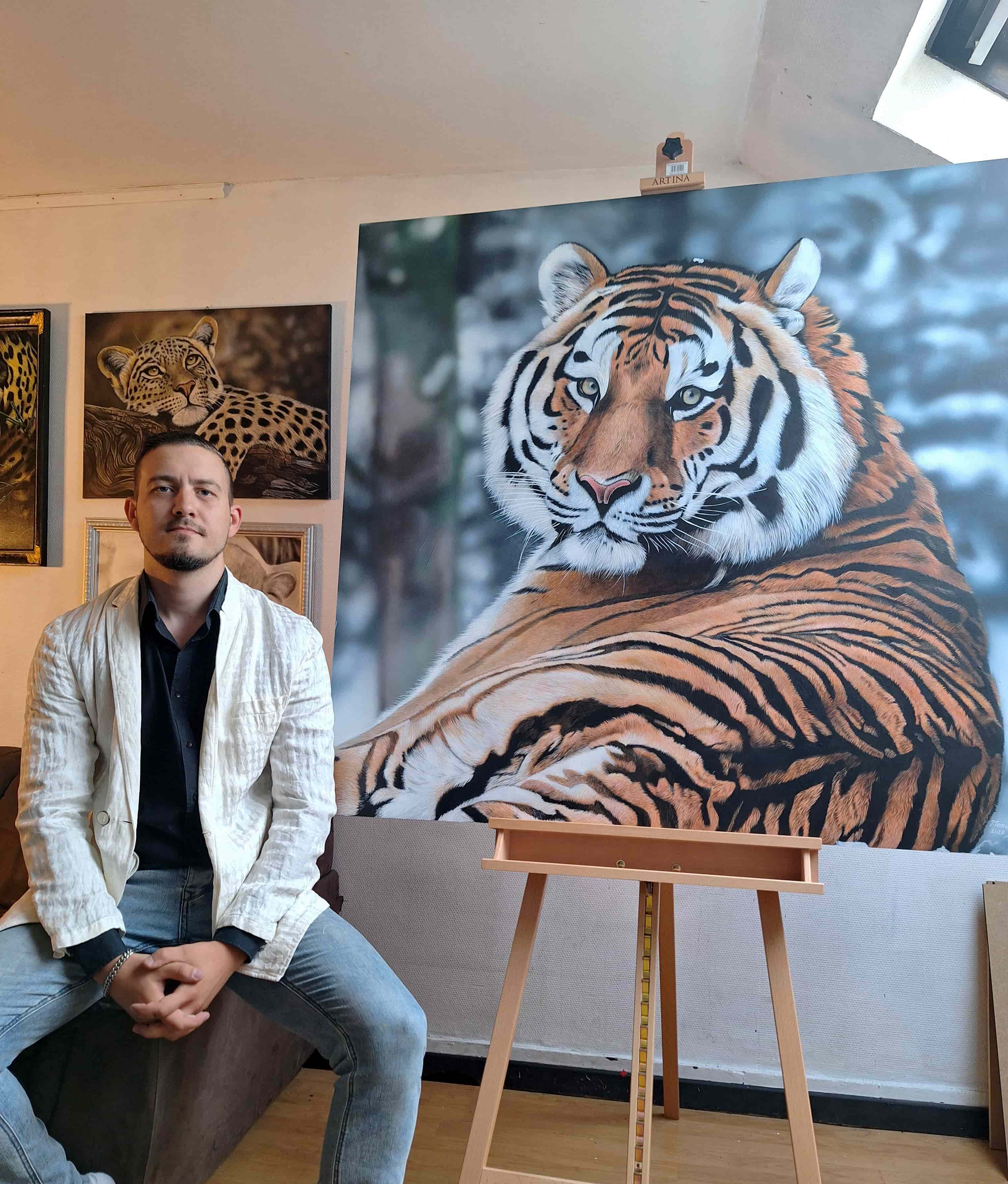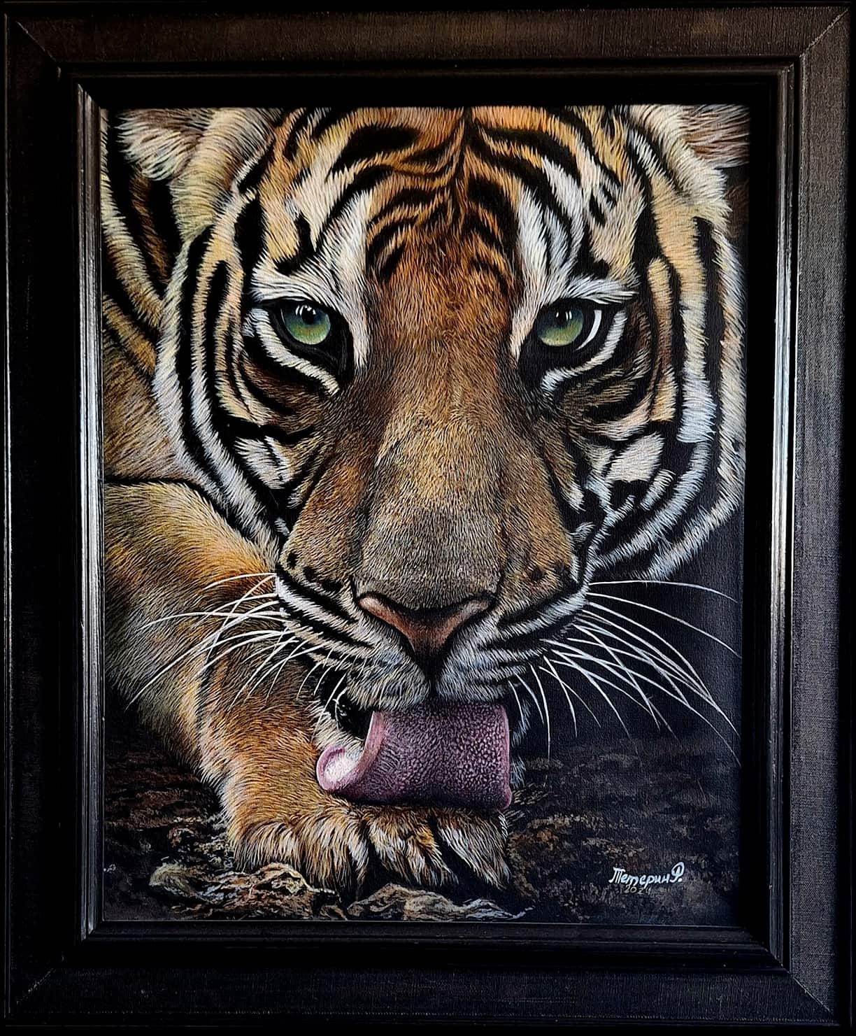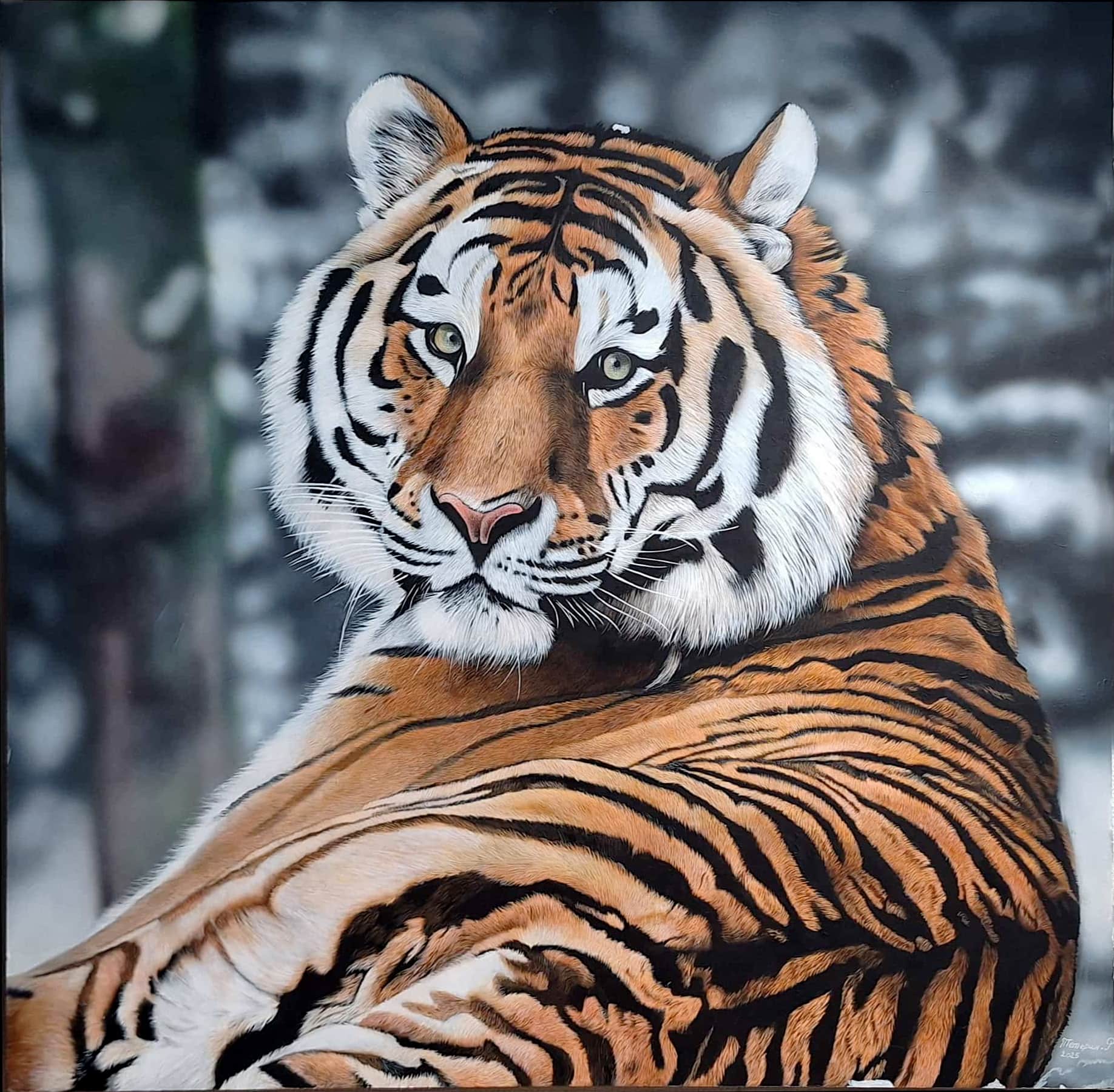 La fourrure, peinte poil par poil, crée une illusion tactile — si réaliste qu’on croit presque pouvoir la toucher. La composition ne se limite pas au réalisme, elle exprime une présence : le tigre domine la toile avec une puissance silencieuse, emplissant l’espace de son aura. Ce n’est pas un prédateur figé dans le temps, mais un être vivant, saisi dans un instant de calme, irradiant noblesse et dignité.