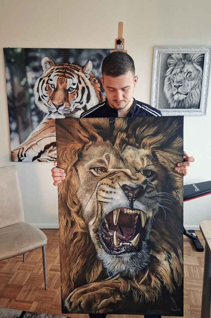 Je réalise des commandes de toute complexité, allant de reproductions de grande qualité jusqu’à l’hyperréalisme le plus exigeant. J’ai également de l’expérience dans le dessin de portraits au crayon et je maîtrise la technique de la brosse sèche à l’huile.